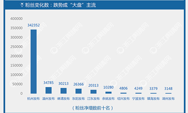 6月,91个账号共涨粉470788,粉丝变化数差距进一步扩大:“杭州发布”继续强势吸粉,前十名涨粉均在3000+,同时“跌势”成为粉丝量“大盘”主流,多达57个账号出现不同程度掉粉,“嘉善微博”、“南湖发布”、“长兴发布”、“义乌发布”、“江干发布”、“西湖发布”跌幅均在1000+。