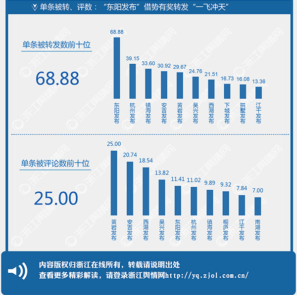 6月,91个账号发布的微博总转、评数分别为168555和72776,与上月的169095和67375相比,均有所下降。其中,“东阳发布”获得“微博平均被转发数”第一,有奖转发助其获得高人气,其中5条相关微博转发均超过1000次。“杭州发布”凭借30893次的被转发量得到转发总量单项冠军。“黄岩发布”、“安吉发布”保持“单条被评论数”和“被评论总数”首位,分别为25条和9394条。