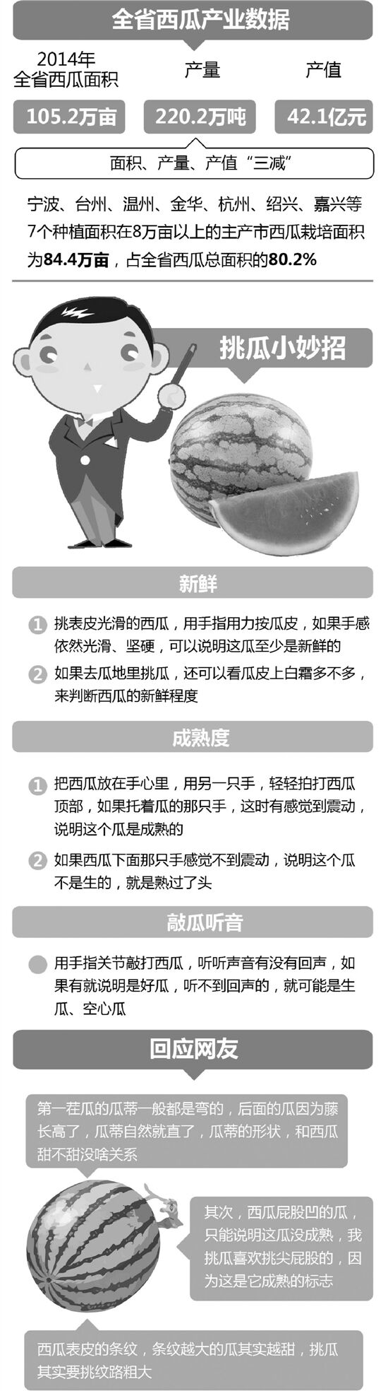 浙江的西瓜产业在全国算是数一数二的。据浙江省农业厅统计,2014年,全省西瓜面积约130万亩,产值近50亿元,宁波、台州、温州、金华、杭州、绍兴、嘉兴等7个主产市,西瓜栽培总面积超过80万亩,占全省西瓜总面积的约80%,其中全省大棚西瓜面积40多万亩,是全国优质设施西瓜大省。