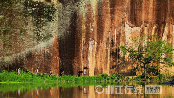 小赤壁景点位于仙都景区的入口处,临溪一面绝壁陡峭,红白相间,犹如焰火烧过,故称小赤壁。西边山巅有形态酷肖的婆媳岩、“舅轿岩”相对。内有龙耕路、大肚岩、小蓬莱、仙榜岩、八仙亭、云关、丹室等自然景观,错落有致,山水相融,构成了一幅风光旖旎的画卷。