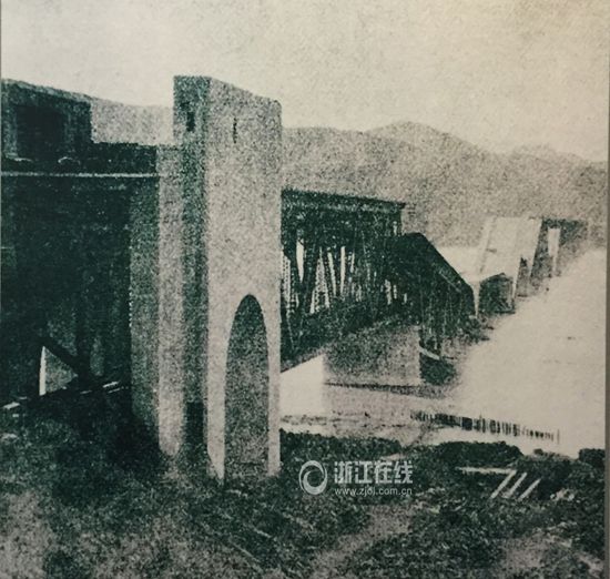今天上午,在浙江图书馆一楼展厅的“浙江抗战历史图片展”里,有一张另一个角度的照片。这张照片同样是被炸毁的钱塘江大桥,只是视角变成了萧山的一侧。之前采写过钱塘江大桥“抗战史”的同事告诉我,他搜集了那么多大桥的资料,这个角度的却从没见过。