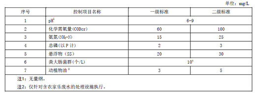 根据农村生活污水主要来源、水质特征等,《标准》确定了pH值、化学需氧量、氨氮、总磷、悬浮物、粪大肠菌群、动植物油等7项主要控制指标及限值。重要水系源头、重要湖泊集水区等水环境功能重要地区执行较高的一级标准,其他地区执行二级标准。