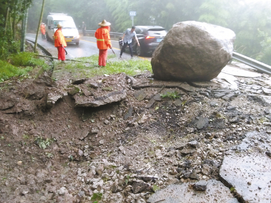 7月8日上午,黄岩百王线K19+500处有巨石滚落,将车道砸出一个大坑,大坑直径宽3米、深2米,边沿路面俱被震裂。黄岩公路局派出11人的应急抢险队奔赴现场,但因巨石从天而降,产生的破坏性极强,预计该路段短期之内难以恢复畅通。