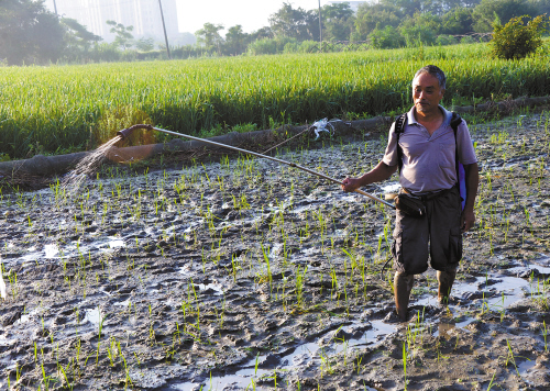 7月13日一大早,箬横镇解放村,农民林富友给受淹后的单季杂交稻喷药。