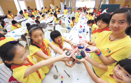 7月16日,参加夏令营的小朋友在展示自己画的石头画。暑假期间,由团市委主办的“共享阳光、快乐成长”关爱公益夏令营在市青少年活动中心举行。来自全市110名少先队员和外来务工人员子女一起,在为期5天的活动中,学习消防、交通安全知识、画画等。