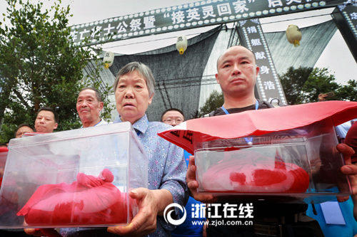 今天上午,抗日战争时期在长沙会战春华山战斗中阵亡的国民革命军74军的118名浙江籍士兵的骨骸及春华山当地泥土,被分装进8个透明的玻璃骨灰盒中,由长沙当地的志愿者交到了已经找到的阵亡将士家属们的手中。