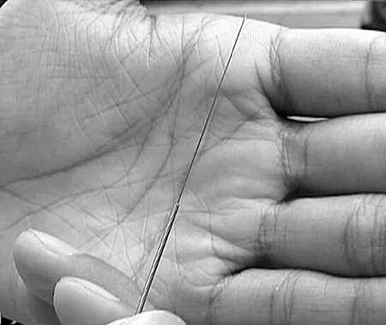 钱报记者注意到,从小黄头上拔下来的这根银针,横放在成人的手心上,恰好够一个手掌的宽度,约10厘米长,和家用的缝衣针相比,一截粗一点,一截细一点。