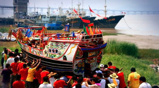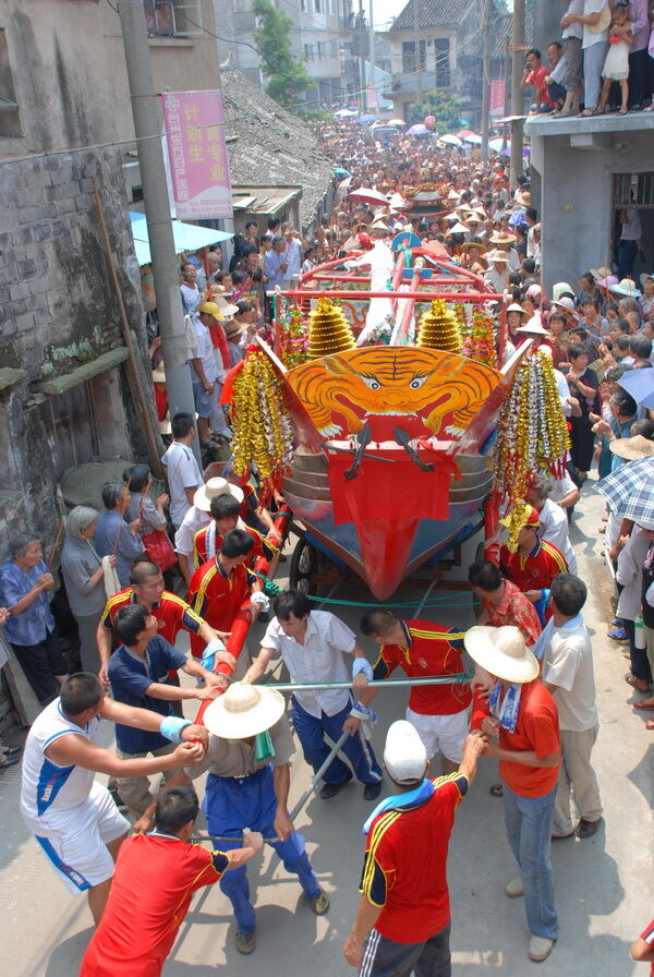来到江畔,由几位老人在大暑船边设坛祭拜后,将五圣神位一一供奉到大暑船上神龛之中,待一切就绪,此时一般正是潮水涨满的时刻,至大暑船被拖出椒江口外白沙洋时,正好开始退潮,借助着潮水的力量,大暑船顺江而下,越漂越远,也带走了人们美好的祝愿。
