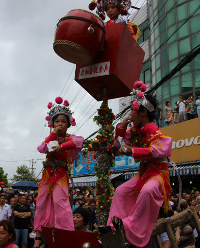 主队伍后面则是走高跷、卖水果、卖梨膏糖、唱桃街、补缸、舞龙、打花鼓等民间艺人化装,作各式即兴表演。最后是身穿红衣裳,颈上套白线(象征铁链锁身),手执香烛还愿的“罪人”队伍,他们都是曾经患重病,因祈祷五圣而病愈,现今趁送大暑船时前来“谢罪”。
