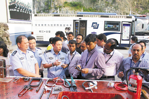 7月27日下午,在浙江警察学院出入境管理培训班学习的22名孟加拉国政府官员,来到椒江区公安分局海门派出所,参观该所预防犯罪中心和市民安防直通车,并向该所防范专家阮林根学习预防犯罪知识。图为当日下午,孟加拉国政府官员正在听阮林根讲解各种防盗产品的使用功能。