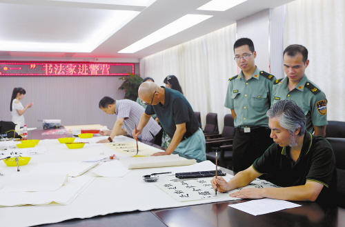 7月29日,市委宣传部联合台州书画院组织部分书画家赴路桥消防大队开展“书画家进警营”活动。书画家们挥毫泼墨,用精美的字画作品为消防官兵献上节日的祝福。