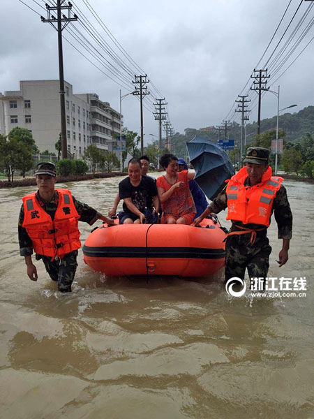 哪里有危难,哪里就有子弟兵的身影。在大雨过后,鳌江流域麻步段出现一个6米长的决口,江水迅速奔涌而出。温州军分区海防营官兵接到命令后,迅速赶赴险情发生地,与当地村民共同展开救援行动,经过15多小时奋战对堤坝完成加固。8月9日凌晨,文成县珊溪镇有多名群众被洪水围困。文成消防大队接警后迅速消防人员到场开展营救。消防人员在凶猛的洪水中拉起横渡绳索,在被淹没的道路区域架设梯子,对行动不便、撤离能力弱的群众,利用救援担架、肩背等方式营救。