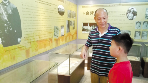 正值暑假,来到纪念馆参观的孩子特别多。7月14日,今年12岁的小男孩谭希在外公的带领下,来到纪念馆参观学习。他一边观看图片资料和文字介绍,一边听胡福云馆长讲解,随后还与外公在李友邦雕像前合照。