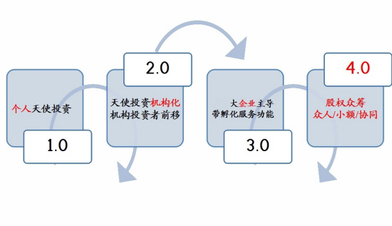 “所以天使投资在随后的发展中不断进化,在2.0时代,天使投资者开始机构化,3.0时代出现大企业主导的带有孵化器功能的投资平台,而现在则演化成专业程度更高,但是投资者门槛更低的新型股权众筹形式。”于小黎说,其公司旗下的“云筹网”平台就是一个专业从事股权众筹的互联网平台。