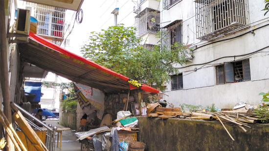 2单元西侧是一幢灵江路的街面房,两幢楼中间隔着5米多宽的过道。记者看到,过道上方搭着一个雨棚,雨棚下堆叠了不少半成品桌椅板凳,一名男子正光着膀子做着木工活。