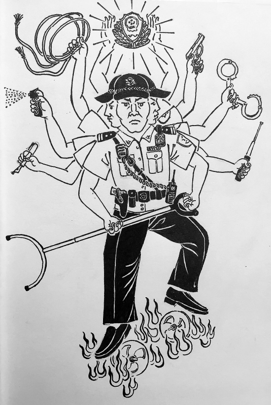 警营生活是充实而又忙碌的。谈到警营生活,王镇拿出一幅他之前画的漫画,穿着警服的民警有如“千手观音”,拿着各种道具,脚踩风火轮。“案子多,赶往现场的速度要快,忙起来真希望自己有三头六臂。”他说。