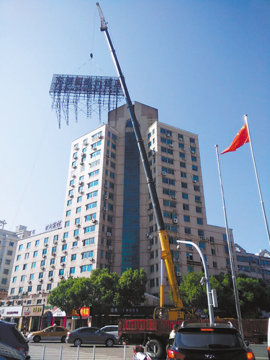 25日,温岭市行政执法局拆下60米高空屋顶广告牌。广告牌位于东城路大宇大厦屋顶,长18米,高10米,重达5吨。广告牌实行整体拆除,落地后进行肢解。拆除工作从清晨5点一直持续到上午12点。据了解,广告牌使用时间已长达20年,底座部分锈蚀,存在严重安全隐患。为保证拆除安全,当日清晨,工作人员对东城路进行封道,并安排人员现场执勤,疏导群众。
