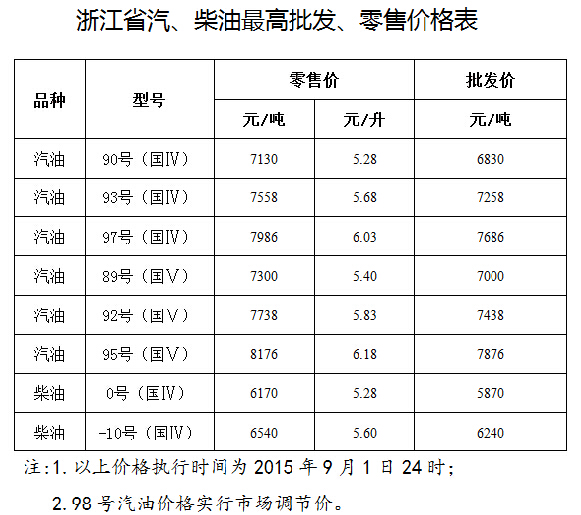 记者今天傍晚从浙江省物价局获悉,9月2日0时起,浙江省汽、柴油最高零售价格每吨降低125和120元。自6月以来,汽油每升已降0.77元,车主们加满一箱油能省39元。