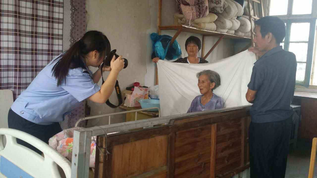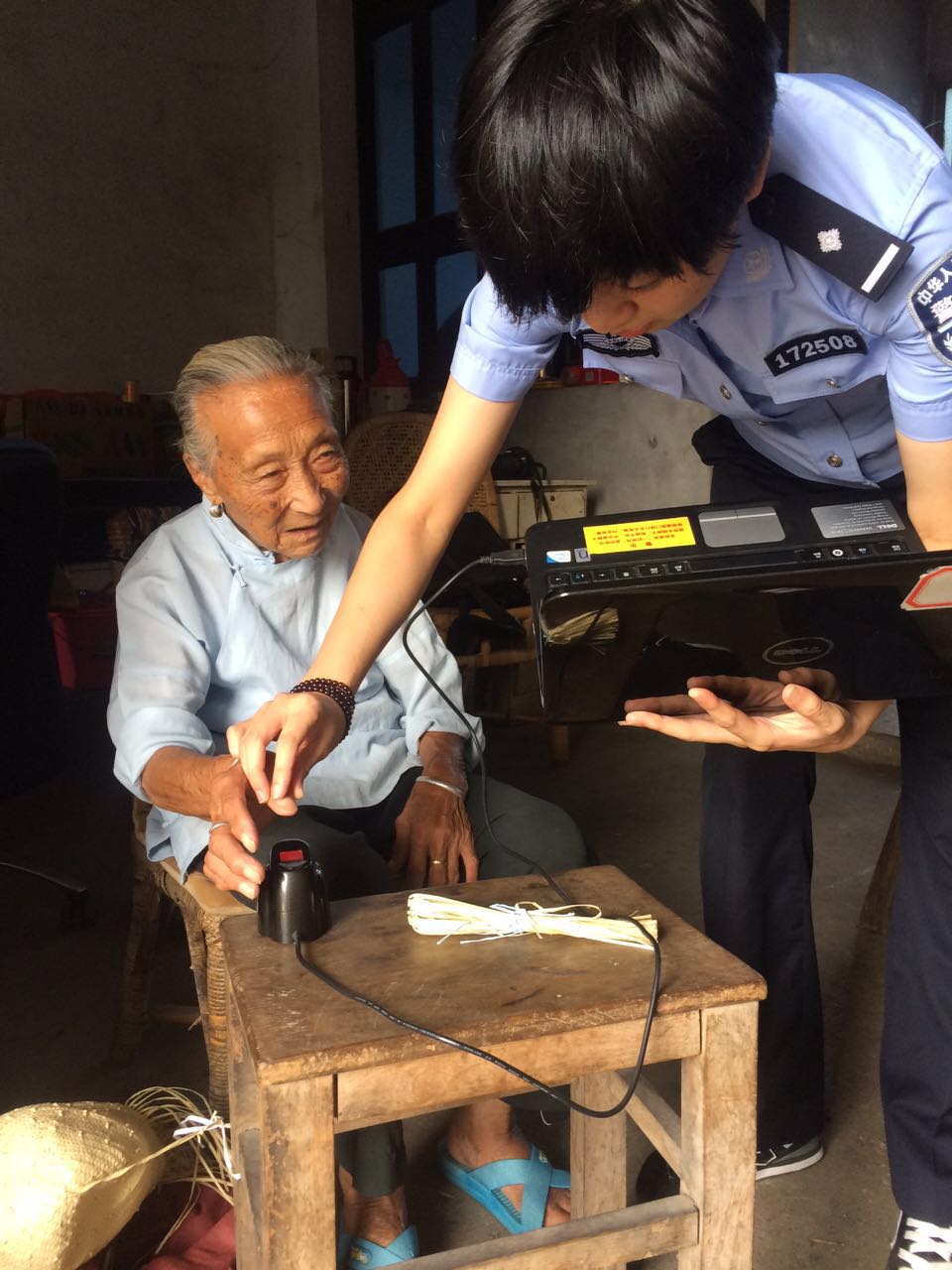 9月1日上午,新河派出所户籍民警柯警官和户籍员小胡带着照相机、指纹采集仪和电脑来到了敬老院,由于李奶奶腿脚不便,小胡就让老人家坐在床上,而她就在床边歪着上身帮她拍照片,一直拍到她家人满意为止。之后,小胡又帮李奶奶采集了指纹,做了相关的核实登记。和李奶奶道别后,柯警官和小胡又赶往下一个老人家里。