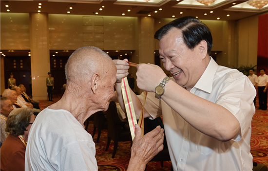 9月1日晚上,中国人民抗日战争胜利70周年纪念章发放仪式,在省人民大会堂举行。省委书记夏宝龙为参加过抗日战争的老战士、老同志代表颁发纪念章。浙江日报记者黄曙林董旭明摄