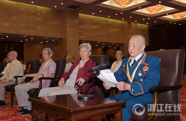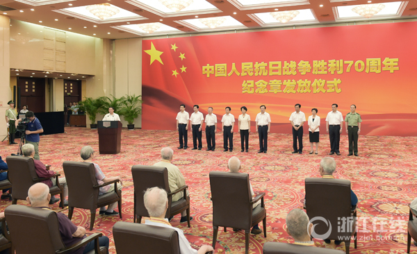 当晚6时30分许,参加过抗日战争的20位老战士、老同志代表陆续来到仪式现场。他们大多年事已高、头发花白,但却个个身板硬朗、精神矍铄。省委书记、省人大常委会主任夏宝龙为老战士、老同志代表颁发纪念章并讲话。李强主持发放仪式。乔传秀、王辉忠、任泽民、葛慧君、刘力伟、袁家军、廖国勋、王新海、赵一德等出席。会上,老战士代表、杭州钢铁厂行政处原副处长陈克作了发言。