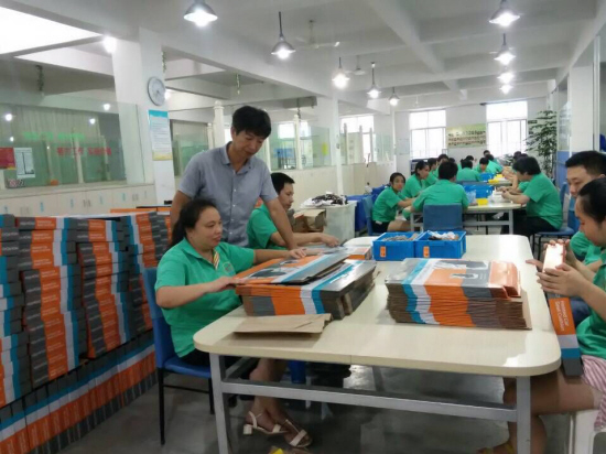 何中豪(左二)在指导工人生产。