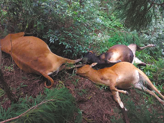 “5头大牛,1头小牛;3头是公的,3头是母的。当时那些黄牛还口吐白沫,旁边的大松树部分树梢折断,树皮剥落,有被雷击的痕迹。”陈荷生说,这些大黄牛都是附近村庄的村民所养,农忙时用于犁地,平时就被放养在山中,待到冬季,再牵回家里。