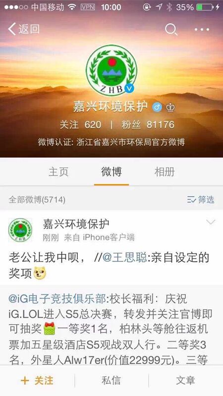 “老公让我中呗。”今天上午,嘉兴市环保局官方微博“嘉兴环境保护”转发了被奉为“国民老公”王思聪的一条微博,并配上了如此令人咋舌的评论,一时间被网友议论。