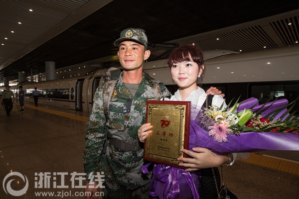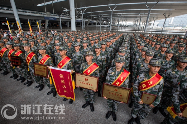 随着G4903次列车停靠杭州东火车站,军乐队奏响中国人民解放军进行曲。官兵们踏着军乐走下列车,立刻被鲜花簇拥......