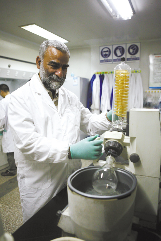 “在中国,青蒿素原料原来都是从植物中提取,但是这一项目现在可以从青蒿酸中合成青蒿素。相对来说,现在半合成技术的成本还比较高,我们现在一直在进行工艺优化,在2013年,我们首次在中国打通了青蒿素半合成的生产工艺,进行了青蒿素的光化学合成,使用紫外线辐射这一新型的工艺从青蒿酸合成青蒿素,我们成功将原来的五步工艺技术,压缩到三步工艺技术,工艺成本降低一倍,而且工艺稳定、生产安全,这工艺在中国是独一无二的。”塔尔略带自豪地介绍。