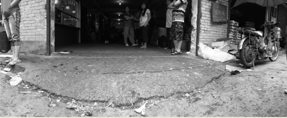 “就在这个时候,一个看上去40多岁的女人骑着一辆电动车,准备冲上坡道到市场里面来,但是这个骑车的人可能一下子没掌握好平衡,电动自行车刚刚冲上坡道就歪歪扭扭,然后向左边摔倒了。”