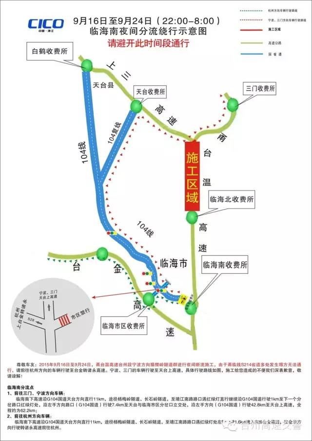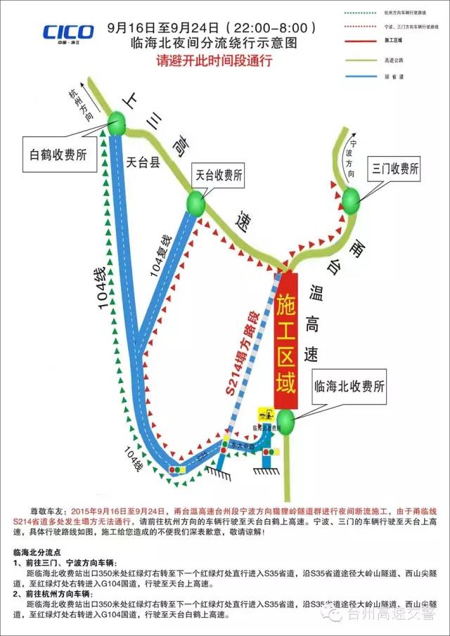 由于甬台温高速猫狸岭隧道群路段隧道抢修、病害处理和罩面施工的需要,9月16日至9月24日晚上22时至次日8时连续9天夜间(如遇雨天,将顺延),宁波方向猫狸岭隧道将断流施工,届时宁波方向临海北、临海南出口将交替分流,累计封闭时间达90小时。