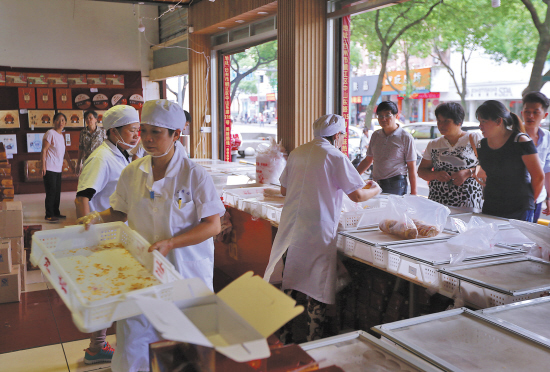 随着中秋佳节的临近,城区处处飘着“月饼香”,各种口味和样式的月饼已摆放在各大商场、超市的醒目处。9月16日,记者走访了城区部分超市、蛋糕店和小商铺发现,散装月饼和一些包装简单大方、价格实惠的月饼颇为走俏,业内人士表示,高价格的礼盒装月饼在市场上几乎绝迹,今年我市月饼市场继续走亲民路线,平价月饼成为市场主流。图为城区一家月饼店里忙碌的场景。