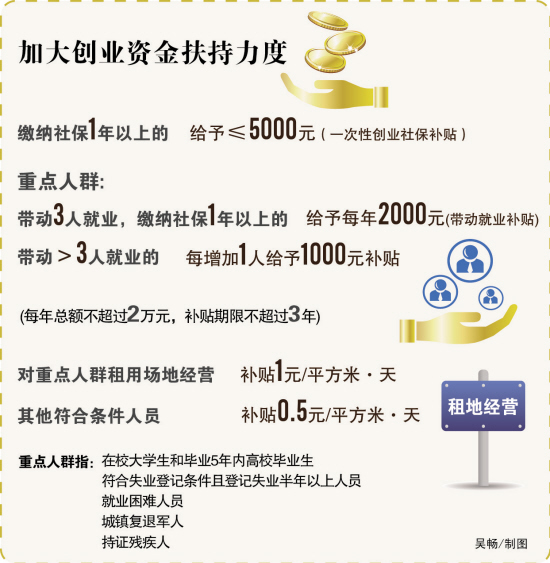 新政策加大了创业资金扶持力度,将创业补助和一次性创业社保补贴合并为一次性创业社保补贴,重点人群创办个体工商户或企业,正常经营并依法缴纳社会保险费1年以上的,给予不超过5000元的一次性创业社保补贴。