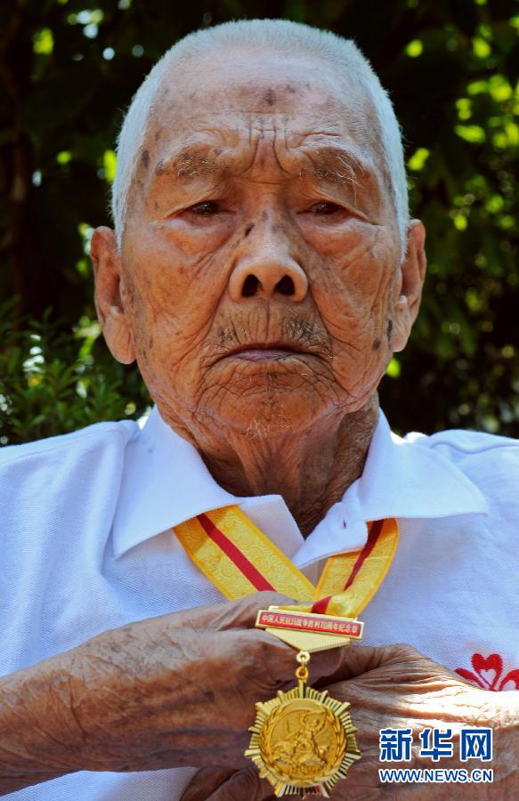 见证国共合作抗日救亡中国人民抗日战争胜利70周年纪念章获得者、天台抗日志愿兵团老兵金洪林说:“当兵打日本是我一生的光荣”(9月11日摄)。金洪林,1917年生,入伍后一直转战浙东、浙中和浙西南抗击日军。日本投降后,他以上等兵军衔回乡务农。新华社记者谭进摄