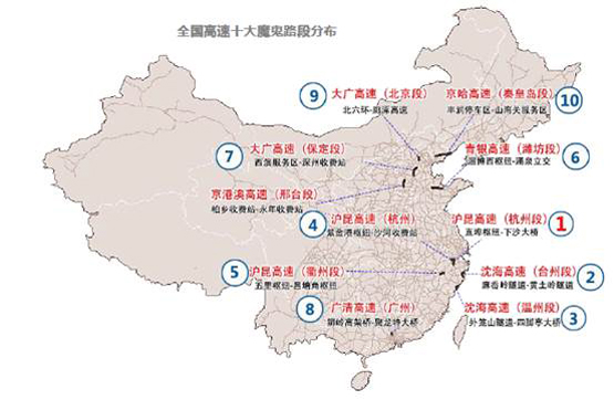 而假日期间全国高速十大事故多发的魔鬼路段,主要集中在车流量大、隧道、立交出入口、货车较多、坡度的地段。