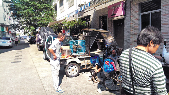昨日上午9点半,记者佯装顾客来到界牌菜场。在和瑞药品超市的对面,发现了市民反映的活禽交易点。一辆电瓶三轮车上,三只老母鸡被关在一个铁笼里,旁边还放着液化煤气罐、大号铝锅、水桶等东西。