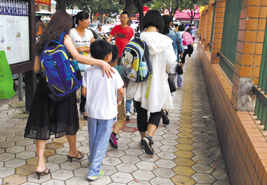 清晨,通往学校的路上,一位头发花白的老人背着书包,手里牵着八九岁的孩子。这样的镜头在平时小学生上下学时间,已经司空见惯。