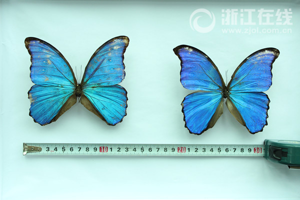 所有闪蝶,不论是闪光的,还是不闪光的,翅的反面或多或少都具有成列的眼状斑纹。此次截获的闪蝶为蓝色,色泽艳丽,眼状斑纹明显,展翅可达140mm,堪称“蓝色妖姬”。