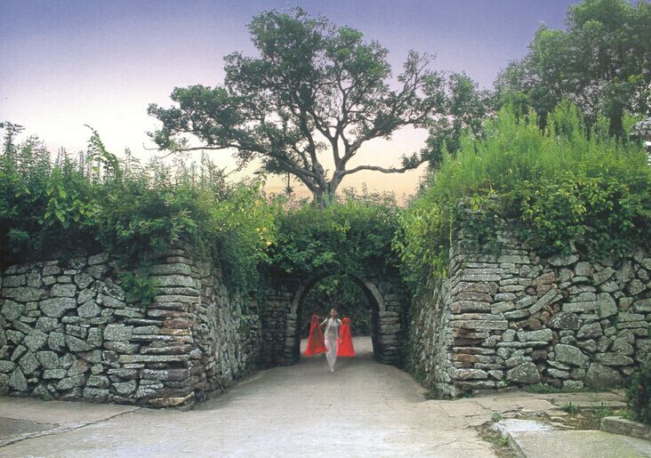 东门是桃渚卫城的正门,进入城门后是个小小而精致的瓮城。岁月流逝,瓮城城墙上繁盛茂密的薜荔藤萝之间,居然长出了一株虬枝苍古的老樟树,映衬着蓝天白云,这古樟的树影显得特别飘逸,清风徐来,树叶漱漱作响。