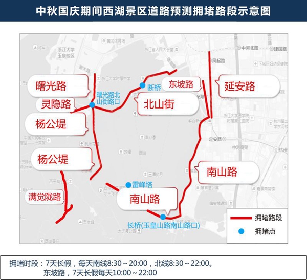 中秋、国庆长假期间(9月26日、27日、10月1日至7日),交警预计西湖景区处于人多、车满状态,南山路、北山街、曙光路、灵隐路、满觉陇路等将出现长时间堵车。