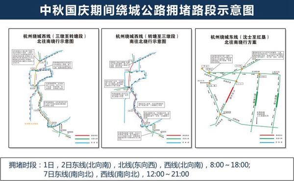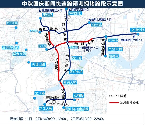 中河、上塘、德胜高架将在中秋节期间、国庆节前段、后段出现大流量,同时,武林商圈、湖滨商圈、吴山商圈等商贸区周边道路在节日期间也会“闹猛”。