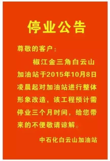 据悉,椒江金三角白云山加油站将于2015年10月8日凌晨起对加油站进行整体形象改造,改造后,加油站环境更加美观、整洁,业务功能体现多样、快捷,便利店商品种类更加丰富、齐全。