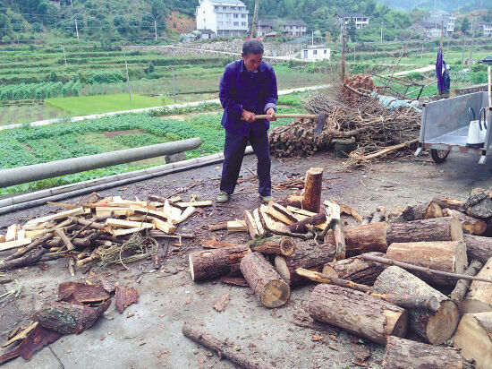 ▲9月21日,在黄岩西部偏远山区富山乡北山村,低收入农户张帮明在家门前挥斧砍柴。