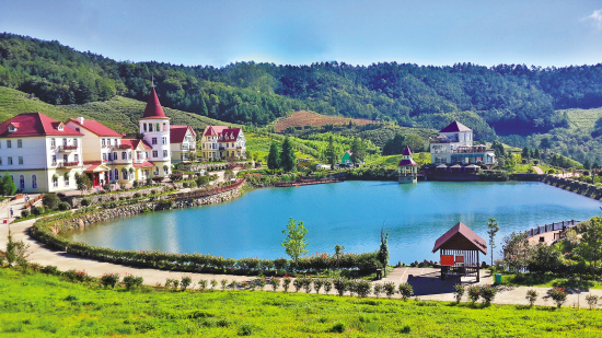 绵延的山峰,日出时、日落时,各有一番景致。南边和西边是罗列整齐的茶田,绿色的一道道,尽管已过了采茶季,但似乎也能闻到绿茶的清香。山庄中间则有一个椭圆形的湖,湖边立着几栋欧式小屋,沿岸有木质长凳、休闲椅,游人可以在这里闲坐或垂钓。