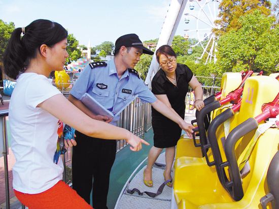 国庆长假即将来临,为保障游客的人身安全,9月16日,台州市公安局椒江分局海门派出所社区民警对辖区公园游乐设施进行安全检查,彻底消除事故隐患,确保入园游客人身安全。图为9月16日上午,海门派出所社区民警正在辖区东山公园检查游乐设施。