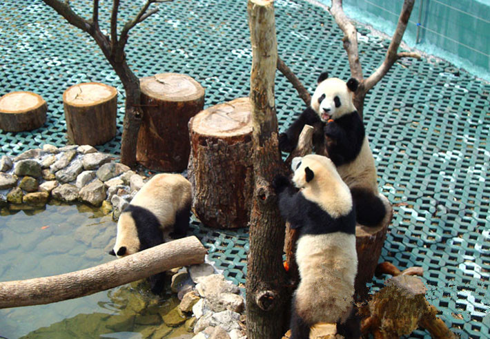 熊猫馆于2009年8月开始建造,2010年2月5日开馆,展馆外翠竹森森,山峰叠翠,十分幽雅恬静。室内的场景则是多位室内设计专家按照熊猫在四川的原生态生活环境原貌仿造。室内水池套叠,池中黑白卵石镶成的图案与建筑相呼应,池边一圈矮石柱与水池相切,别有情趣。四周墙面附着熊猫的图片、文字介绍。生活其中的就是参加过奥运会展览的明星:淘淘、欢欢、福娃。我见到欢欢和淘淘的时候,淘淘正悠闲地吃着东西,而欢欢则像个贪睡的孩子一样歪着脑袋卧在一旁,憨态可掬。