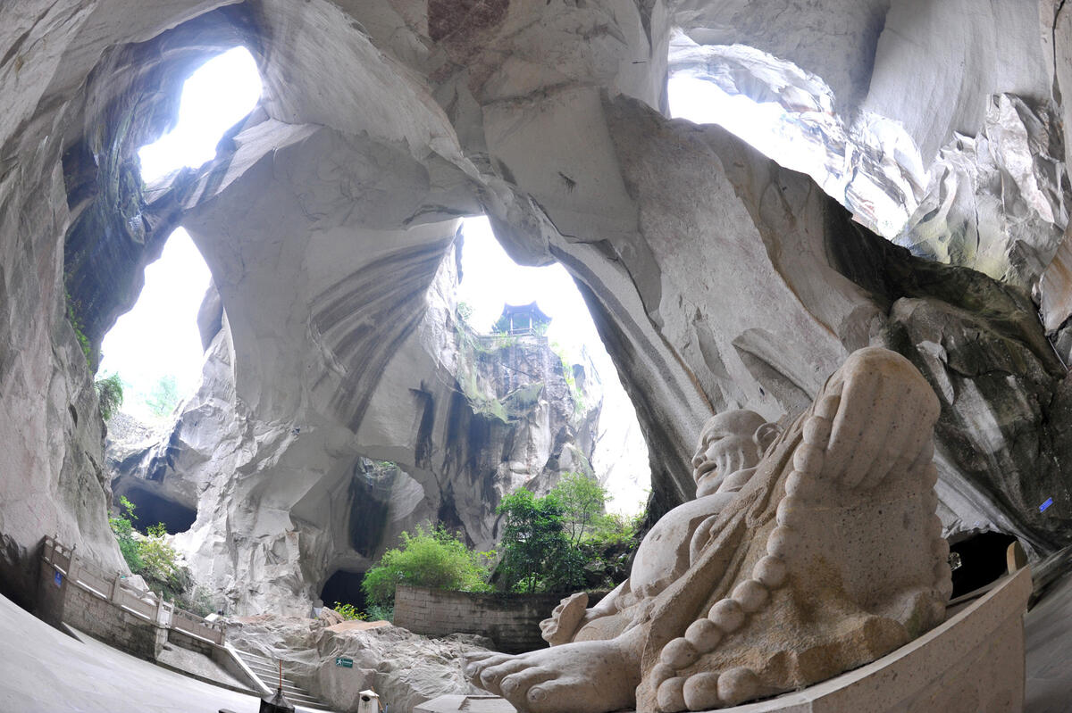 举头但见弥勒大佛笑迎八方来宾,这是一尊用硐内巨石雕刻而成的大佛。就地取材雕刻的世界第一大石碗等景观,犹如出水芙蓉,征服了南来北往的万千游客。