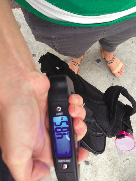 记者随机选择了不同年级段学生的书包进行称重。最后统计的结果显示,一二年级学生们的书包中,最重的是9.36斤,最轻的2.22斤,平均重量5.56斤。