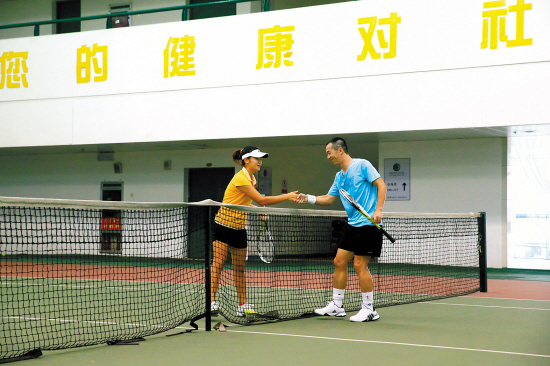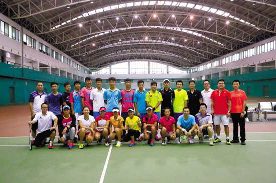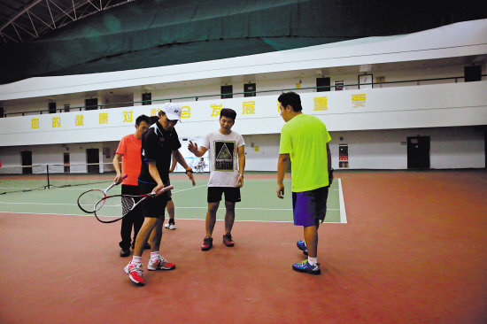 昨日下午2时30分,台州市体育中心网球馆内,着专业网球拍包的台州网球爱好者济济一堂。